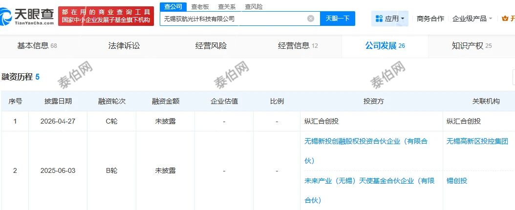 世界赛押注讯,据天眼查消息,无锡驭航光计科技有限公司(简称“驭航光计”)4月27日获得由纵汇合创投投资的C轮融资。